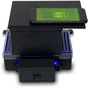 Once the myGel InstaView System is set up, simply slide the mini LED transilluminator into place under the tank and at any time turn it on to view the run in real-time. An array of blue LEDs emits bright blue light at a wavelength of 465nm for optimal excitation of common green fluorescent stains such as SmartGlow™, SYBYR™ Green, and Gel Green, without damaging DNA. An orange filter is incorporated into the lid for visualizing DNA bands without any additional equipment or special glasses. When it’s time to document results, place the included gel imaging enclosure over top of the myGel InstaView, and use the camera app on any smartphone to capture high-resolution images without removing the gel from the tank.