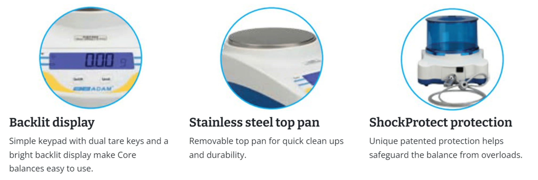 The Core series from Adam Equipment is the best choice for simple operation and economy. The tough durable ABS housing is designed to withstand field and laboratory environments, while being easy to clean and protected from accidental spills. With built-in ShockProtect protection Core balances can handle excessive overloads without a problem. Complete with a removable draft shield, AC adapter, plus integral security slot, Core balances are ready to work right out of the box.