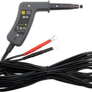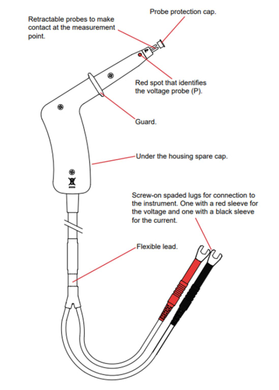 The AEMC 2118.85 pistol-grip spring loaded 25 A test probes can measure low resistances very accurately using micro-ohmmeters with .157-to-.236-inch (4 to 6 mm) diameter binding posts or .157-inch (4 mm) diameter safety terminals. The pistol-grip spring loaded test probes ensure good contact at the measurement point even if the surface is uneven. Each 25 A test probe has very low resistance. The measurement is made in 4-wire mode, so lead resistance compensation is not necessary.
