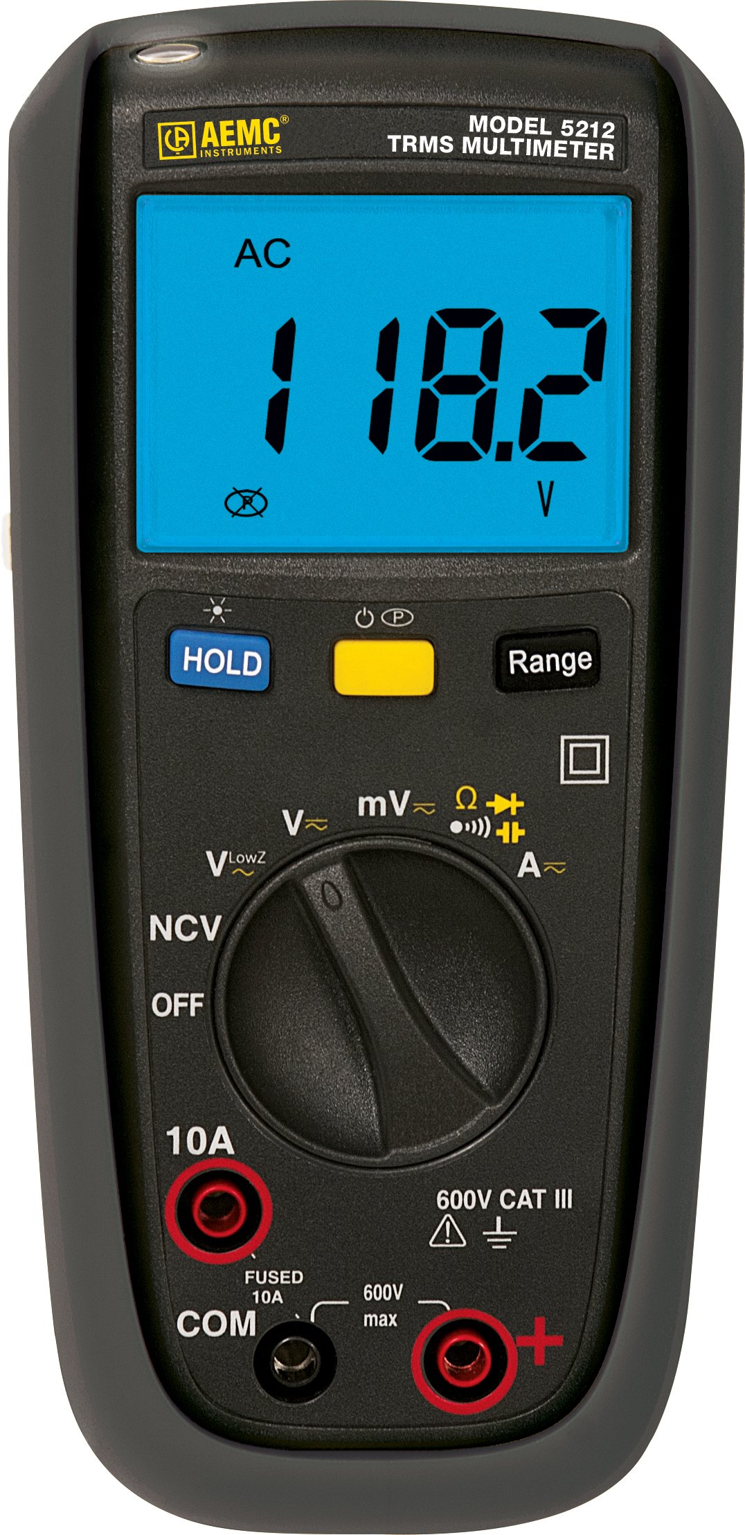 The Model 5212 is a portable hand-held multimeter that measures a variety of electrical and physical quantities including voltage (AC and DC), resistance, capacitance, frequency. These instruments can also perform continuity checks, voltage detection, and diode testing (including forward bias voltage). Measurement features include Auto Range mode, which enables the instrument to select the best range for the input detected, and a Data HOLD function. This instrument is rugged and simple to use and rated to 600V CAT III.