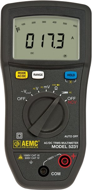 The Model 5231 is a rugged, economical TRMS digital multimeter with a non-electrical contact testing (NCV) function for detecting live electrical circuits. This multimeter is designed for safety: IEC61010 600V CAT IV. The Multimeter Model 5231 provides a Volt, Ohm, Continuity, Diode function, as well as an AC voltmeter function with low input impedance that is capable of finding ghost voltages by adding a burden to the circuit. It performs AC/DC direct reading current measurements up to 600A with a current clamp accessory plugged in.