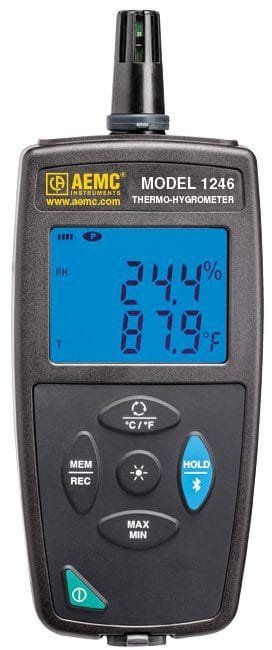 The Thermo-Hygrometer Data Logger Model 1246 is a portable, compact digital meter designed for simplicity and one-hand operation. The main advantage of the logger is its ability to perform a variety of recording tasks with an easy and intuitive setup from a computer using supplied DataView® software. The meter uses an NTC as the temperature sensor, providing excellent response time to changes in temperature, good repeatability, and accurate readings. The Model 1246 also utilizes a thin-film polymer capacitive type relative humidity sensor as a hygrometer sensor, offering excellent recovery from 100% moisture, and fast response time and durability.