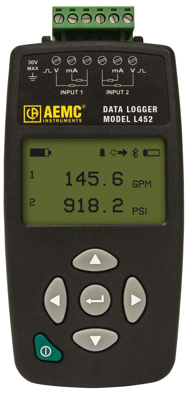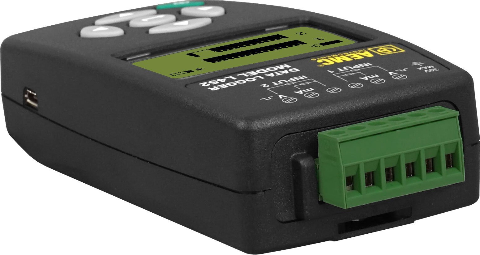 The L452 can log DC voltage, DC current, 4 to 20mA pulse counts, or events, using either one or two independent inputs. The L452 features an onboard menu-based interface for navigating measurement data and selecting configuration options. This Control Panel also enables users to change settings on the instrument, view real-time measurements, schedule recording sessions, and perform other configuration tasks.