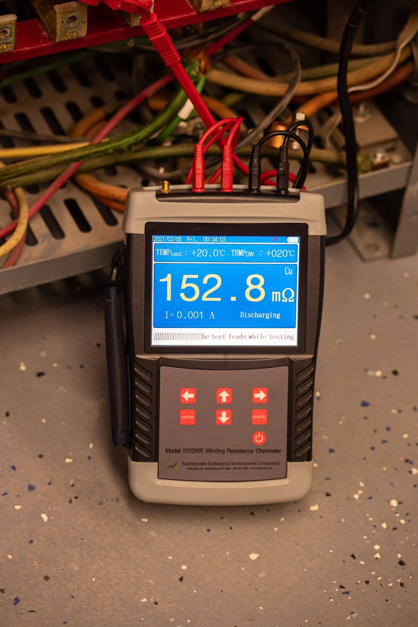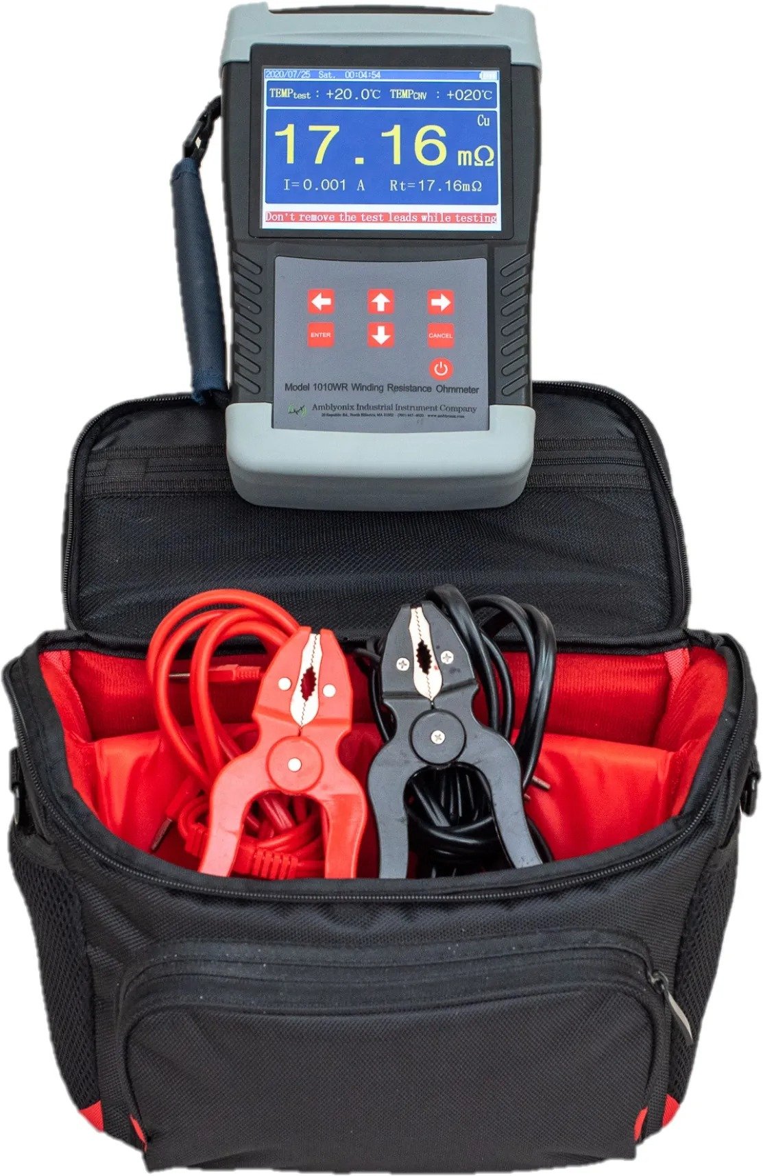 Winding resistance measurements are quick and easy to perform using the Amblyonix Amblyonix 1010WR Winding Resistance Ohmmeter. Compact, light-weight, and battery-operated, the 1010WR is designed to provide years of rugged, portable service. Six output current ranges support a broad range of resistance measurements. Readings can be temperature compensated and stored or exported for further analysis. Equipped with a 5.6-inch super-industrial, high-intensity, color liquid-crystal display, measurements are clearly visible under strong sun-lit conditions. After a single charge, hundreds of continuous measurements can be performed.