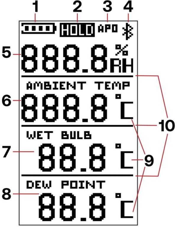 • Accurately measure relative humidity, ambient temperature, wet bulb and dew point