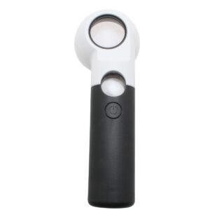 Featuring two lenses (10x | 30x), this handheld magnifier can provide a wide field of view, as well as an up-close look at objects. 6 evenly spaced LEDs surround the 10x lens, while a single LED illuminates objects below the 30x lens. The LEDs can be turned on/off by pressing the button on the handle (batteries not included).