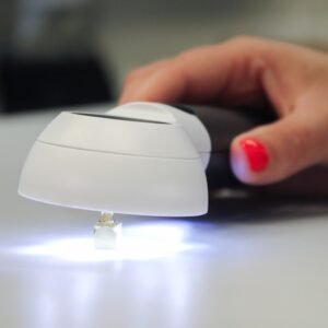 Handheld LED magnifier with 10x and 30x lenses. A high-intensity 6 LED ring light surrounds the main lens for even light distribution, with an additional single LED to illuminate objects beneath the 30x lens.