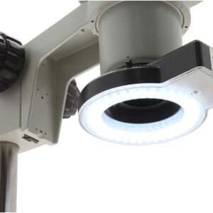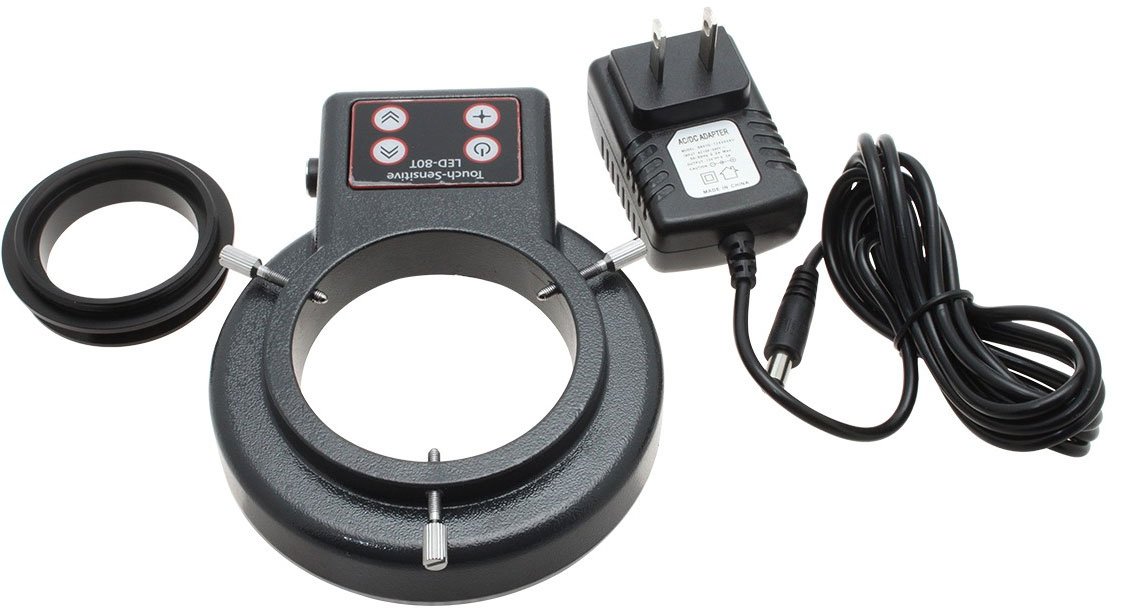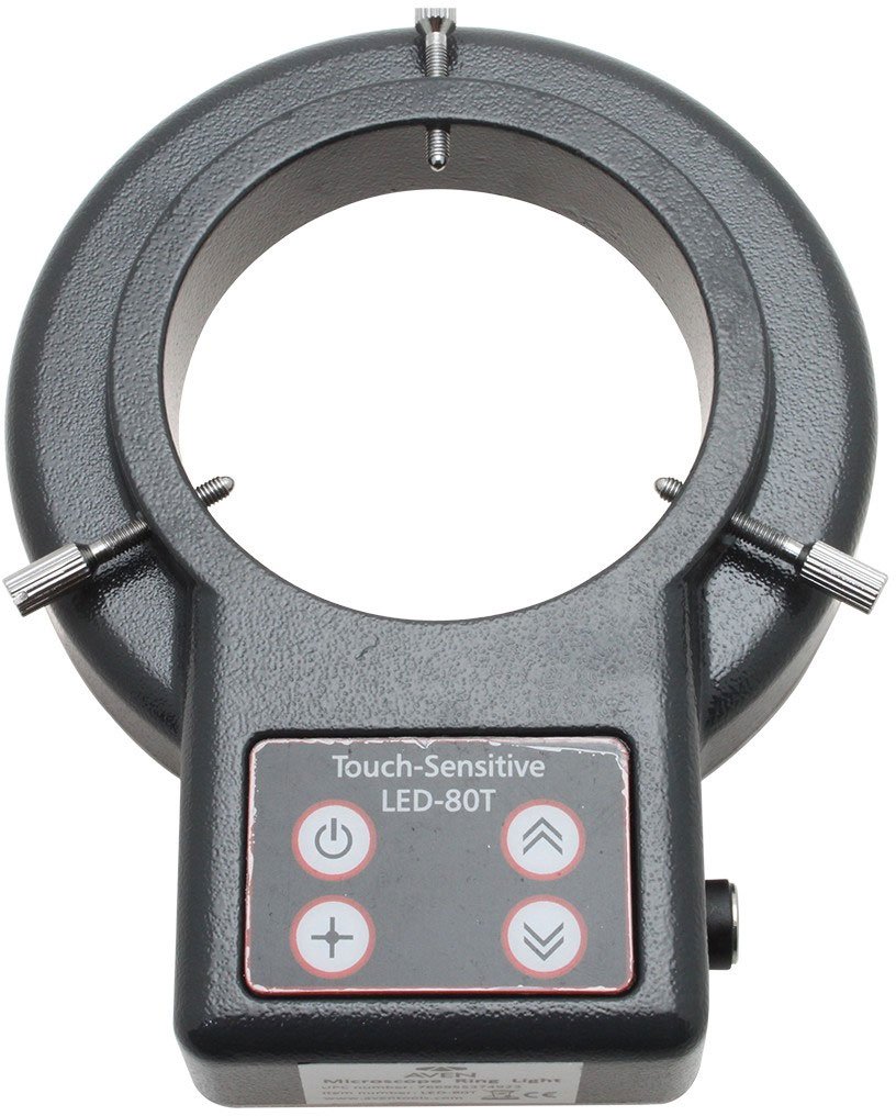 The 80 LED Ring Light with Touch Control is designed to provide bright and even illumination for your microscope inspection system. The touch sensitive buttons allow users to control the brightness and LED quadrant. The four quadrants can be individually controlled to provide users with ideal illumination over the specimen being viewed.