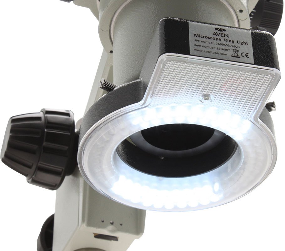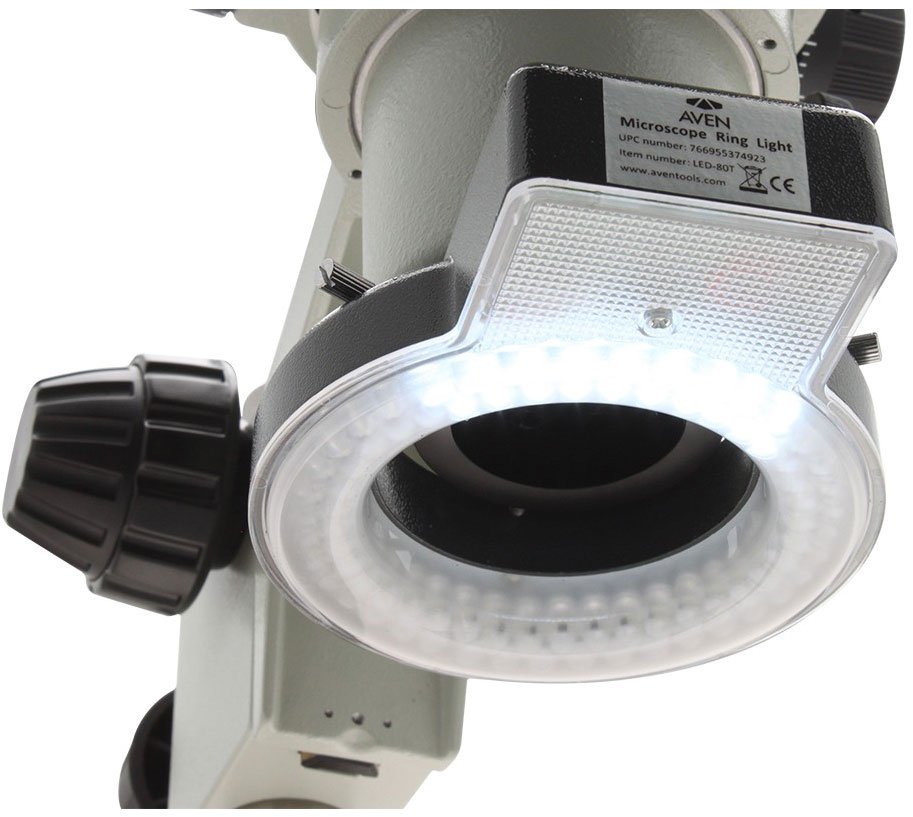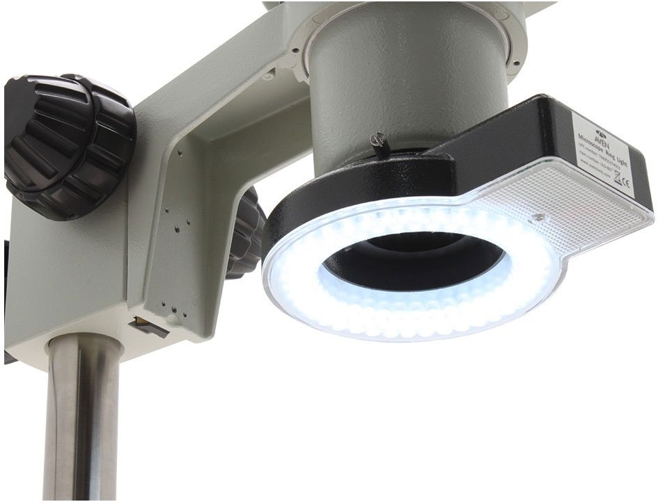 The included ring light adapter screws to the bottom of all Aven stereo zoom microscopes, providing easy and secure ring light attachment.