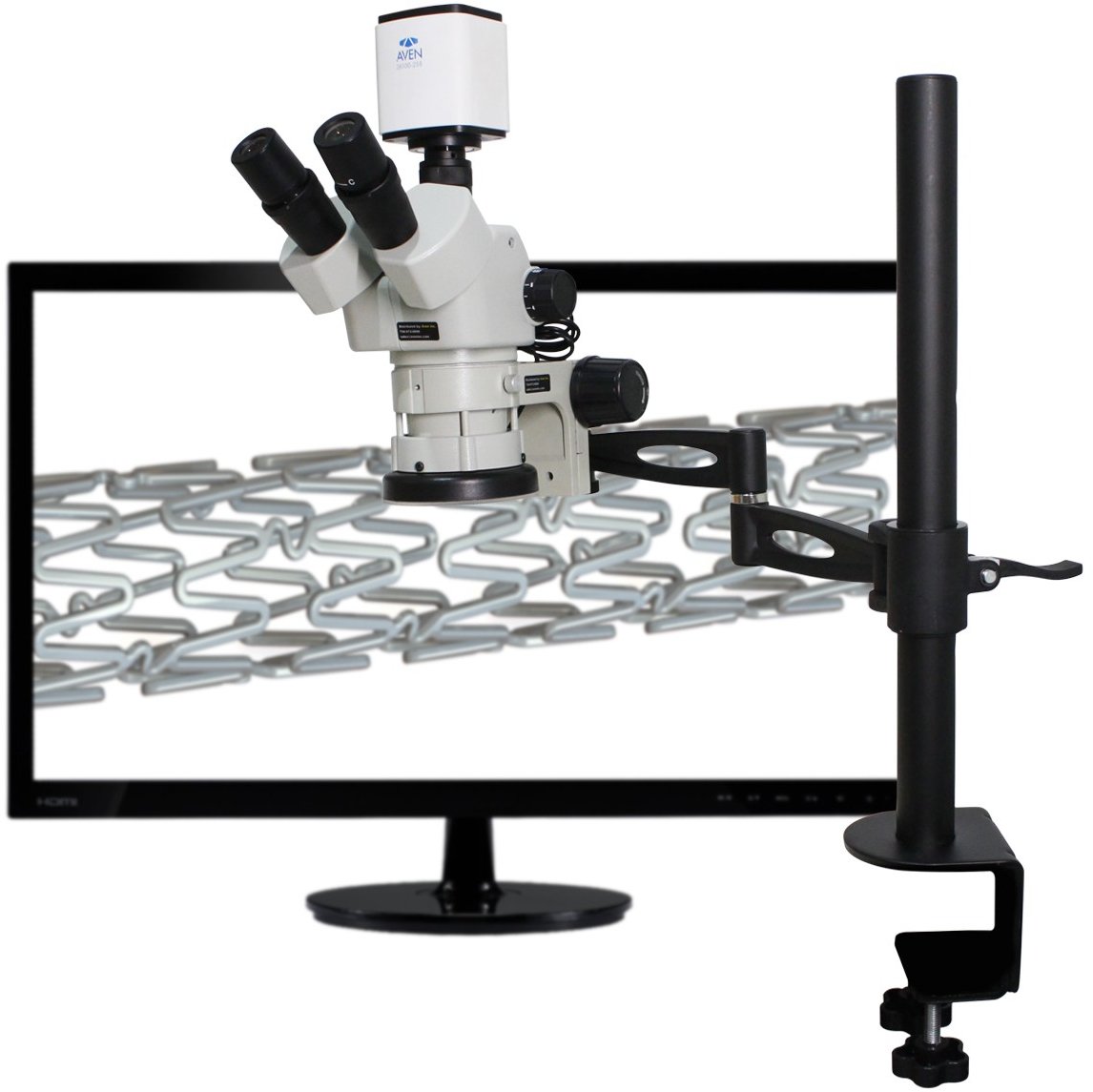 The Aven Tools SPZV50-258-553 comes with the SPZV-50 stereo zoom trinocular microscope, the Mighty Cam Pro on a compact articulating arm stand, LED ring light focus mount, and a 22-inch LCD HD monitor. It is a high-definition 1080P auto focus inspection system offering superb image quality at 60 frames per second.