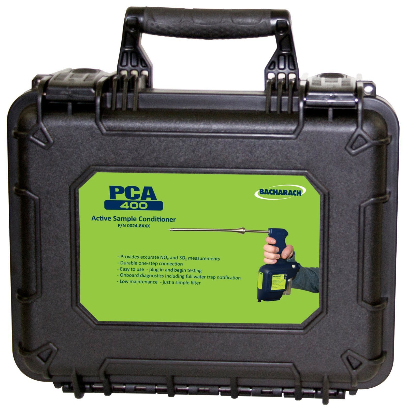Bacharach’s active sample conditioner is used to enhance the performance of the PCA 400 Combustion and Emissions Analyzer in heavy industrial and commercial settings. The PCA 400 provides accurate readings for CO, O2, and NO with a standard probe. Bacharach also offers optional VitonTM tubing with the sample conditioner to eliminate sample dropout, ensuring accurate results in applications where NO2 and SO2 measurements are necessary. The sample conditioner removes water vapor from the stack gas sample, preventing the formation of water droplets inside the analyzer’s probe hose. Water in the sample hose could absorb a portion of the gas sample and result in lower than actual readings of NO2 and SO2. The water extracted from the gas sample is pulled out of the thermoelectric (Peltier) cooler and into a water catch pot. The dry, conditioned flue-gas sample is then passed through to the PCA 400 for analysis, ensuring a clean, dry, accurate air sample. This also prevents water passing into the instrument and possibly damaging the sensors or other components.
