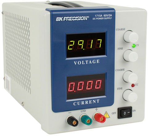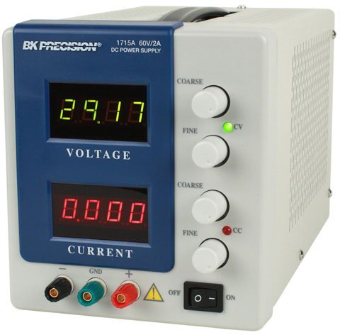 The BK Precision Model 1715A DC Power Supply is a high quality, general purpose dc power source. It provides 0-60 volts dc output, adjustable with both coarse and fine controls for precise settability. The current output is 0-2 amps, adjustable with both coarse and fine current controls. Two current ranges, High and Low, provide excellent current settability and meter resolution. Two large LED meters continuously monitor the output voltage current. The voltage meter is green, while the current meter is red.