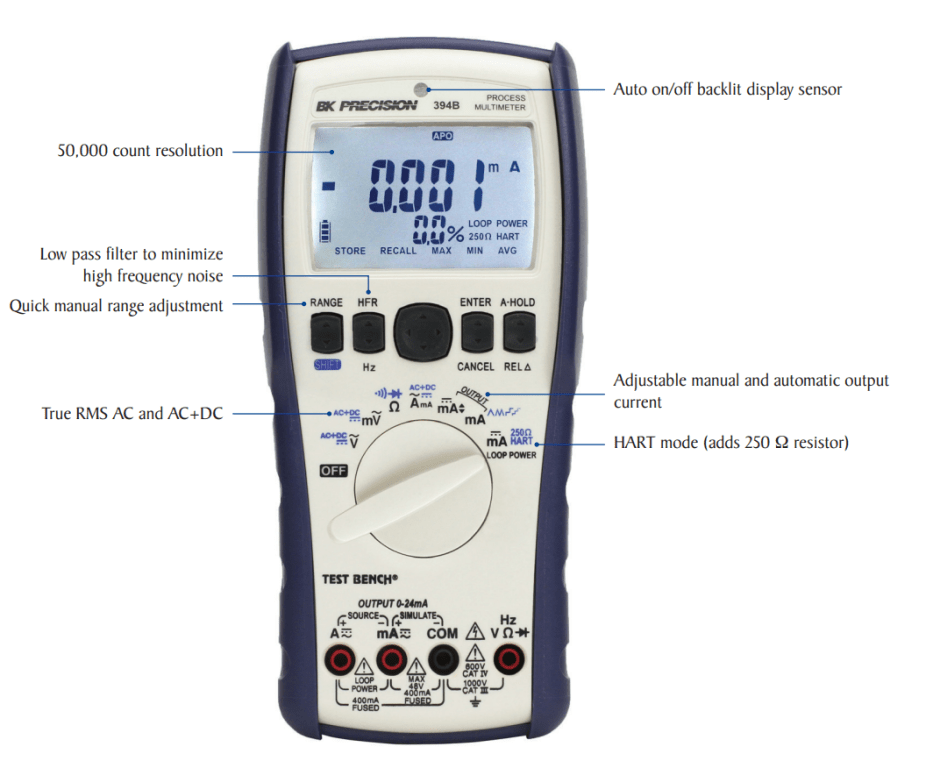 The 394B Process Multimeter combines the capabilities of a mA loop calibrator with a full-featured True RMS multimeter in one package.