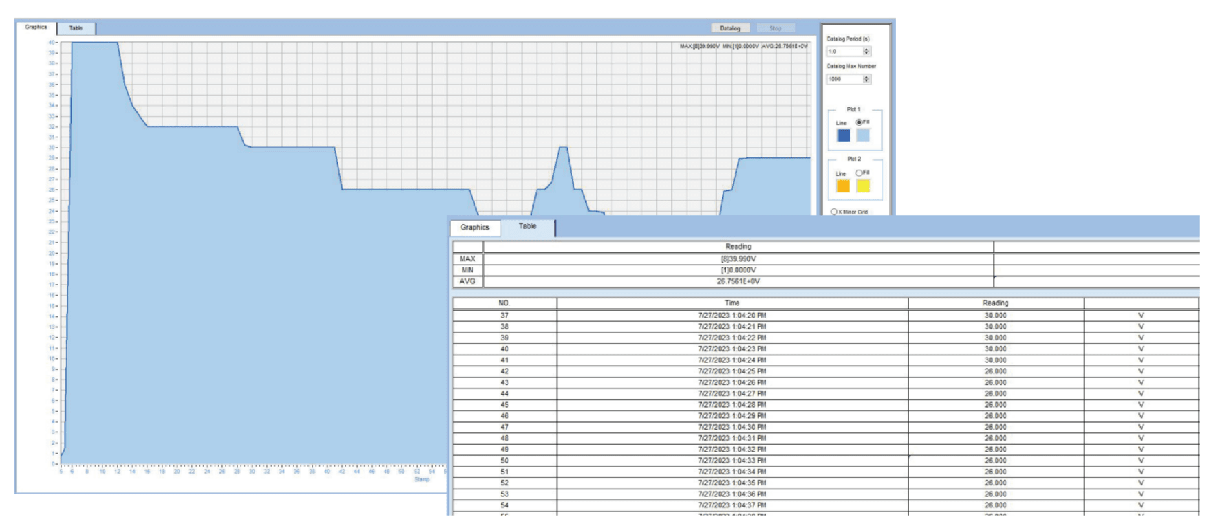 PC software can log measurement data at specified intervals with date and time stamps. Log up to 100,000 data points in graph or table format. Measurement data recorded in the field can be exported using the software for analysis.
