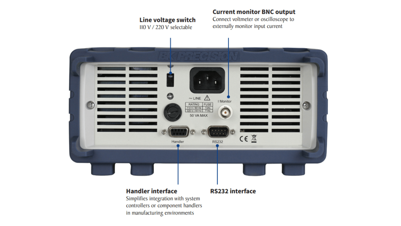Operating software and battery test software are provided for remote PC control and monitoring through the RS232 interface. The general-purpose handler interface offers a pass/fail feedback and simplifies integration with PLC devices, commonly found in production and manufacturing environments. Measurement data and other parameters can be logged directly to a flash drive connected to the front panel USB host port.
