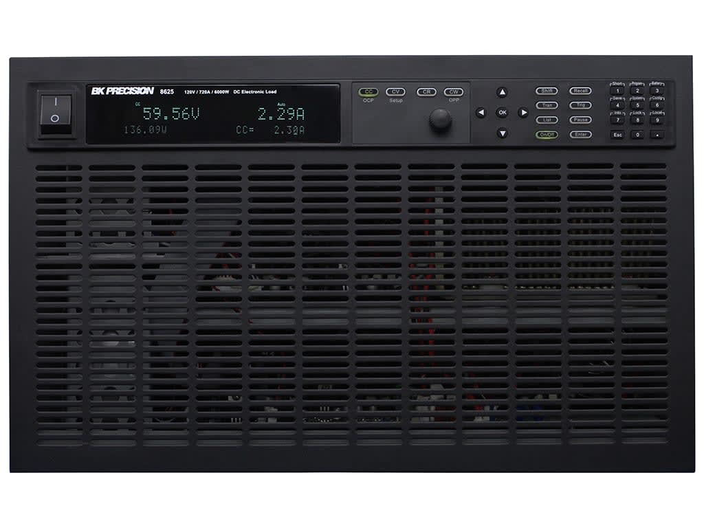 The BK Precision 8625 programmable DC electronic load provides the performance of modular system DC electronic loads in a compact benchtop form factor. With fast transient operation speeds up to 25 kHz, and high 16-bit measurement resolution and accuracy, this DC load can be used for testing and evaluating a variety of DC sources such as DC power supplies, DC-DC converters, batteries, battery chargers, and photovoltaic arrays.