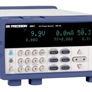 The BK Precision 9801 is both a programmable AC source and measurement tool. This fully programmable linear AC source delivers a maximum of 300 VA through the universal line output terminals on the front and the output connector on the rear. The output can be varied from 0 to 300 V with 0.1 V programming resolution. The output frequency can also be adjusted from 45 Hz to 500 Hz with start and stop phase angles from 0 to 360 degrees. The bright VFD display shows Vrms, Irms, Ipeak, frequency, power factor (PF), apparent power, true power, and elapsed output time.