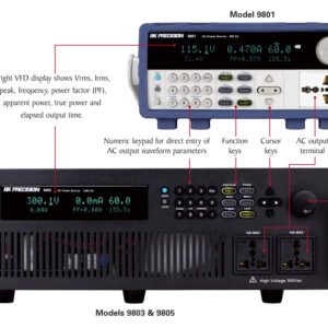 The BK Precision 9803 is both a programmable AC source and measurement tool. This fully programmable linear AC source delivers a maximum of 750 VA through the universal line output terminals on the front and the output connector on the rear. The output can be varied from 0 to 300 V with 0.1 V programming resolution. The output frequency can also be adjusted from 45 Hz to 500 Hz with start and stop phase angles from 0 to 360 degrees. The bright VFD display shows Vrms, Irms, Ipeak, frequency, power factor (PF), apparent power, true power, and elapsed output time.