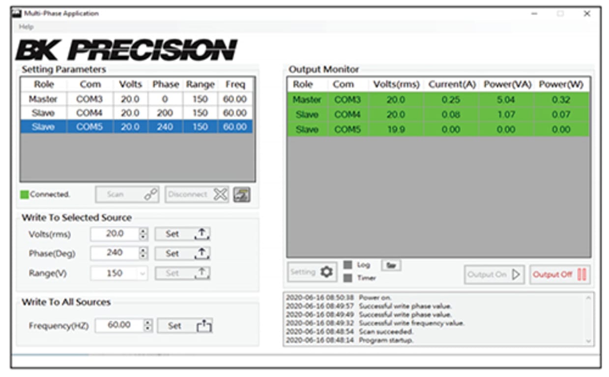 Control voltage and frequency of the three-phase system remotely using the application software. Phase values are fixed at 0º, 120º, and 240º. The output monitor window displays live voltage, current, and power measurements for each connected AC source.