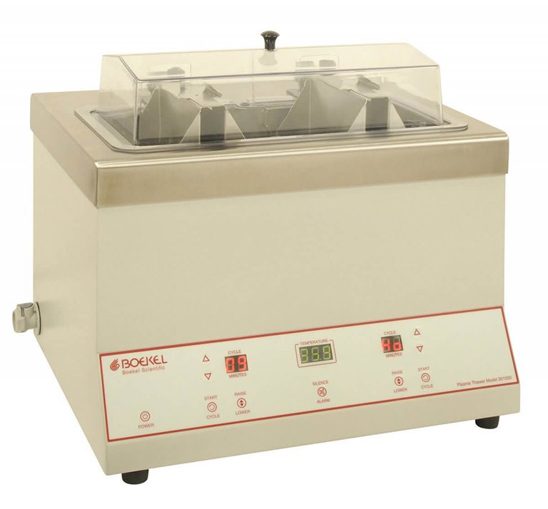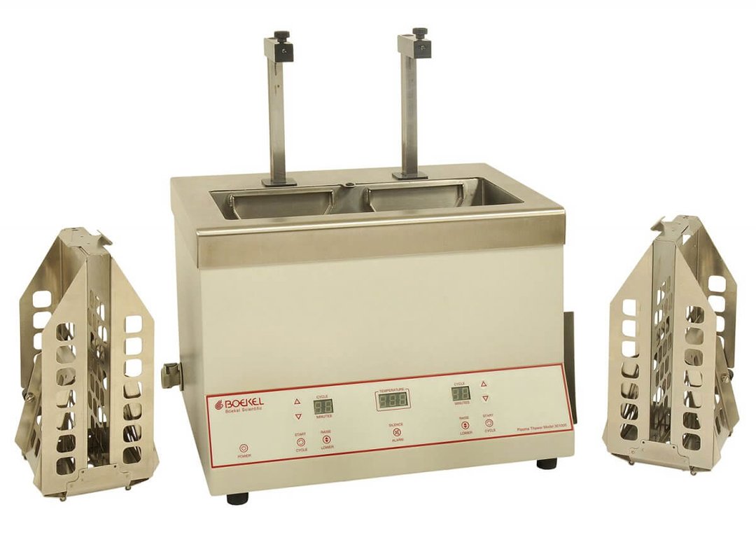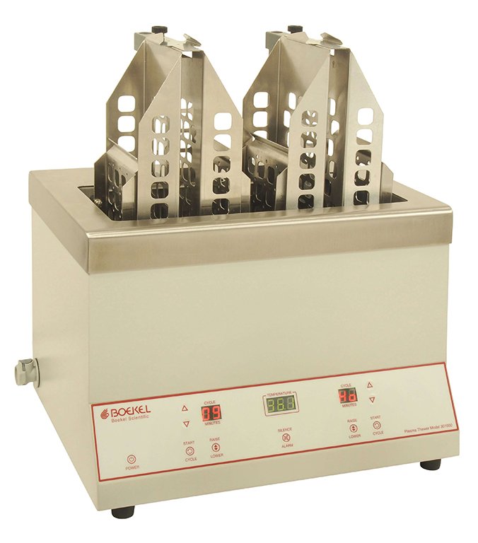 The Boekel Scientific Plasma Thawer is designed for use in Blood Banks and Laboratories where it is required to thaw up to four units of Fresh Frozen Plasma or Cryoprecipitated AHF for future infusion into a patient. This unit utilizes microprocessor temperature control along with agitation to ensure efficient thaw times and each basket has independent controls and alarms which lets the user know when the cycle time is complete.