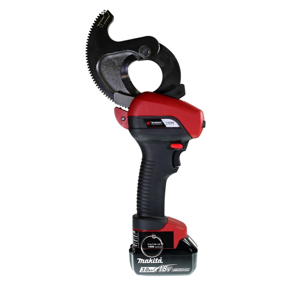 The Burndy Patriot PATCUT1500 is a battery-actuated cable cutter for Copper/Aluminum. The Burndy Patriot PATCUT1500 features a variable speed trigger for controlled cuts and a large, new cutting blade design providing the broadest cutting range in its class (up to 1500 kcmil). Safety features on the Burndy PATCUT1500 include a forward/reverse switch with a locking position, a large, non-skid bumper for stability, and an LED work light for low-light visibility.