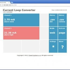 Converter Web Sensor P2520 is designed for the connection of two sensors with current output into Ethernet network. The measured current (0-20mA or 4-20mA) can be converted to the physical quantity that is measured by the connected sensor. The converter is galvanically isolated from the Ethernet communication lines, current inputs and power supply are not galvanically isolated.