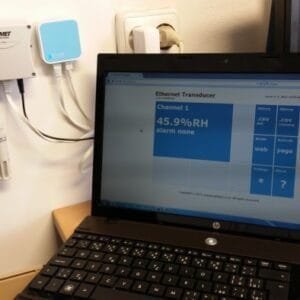 Measured values can be read using an Ethernet connection. The following formats of Ethernet communication are supported: www pages with user-design possibility, Modbus TCP protocol, SNMPv1 protocol, SOAP protocol, and XML. The instrument may send also a warning message if the measured value exceeds adjusted limit. The messages can be sent up to 3 e-mail addresses or to Syslog server and can be sent by SNMP Trap too. The alarm states are also displayed on the websites. The device setup can be made by the TSensor software.