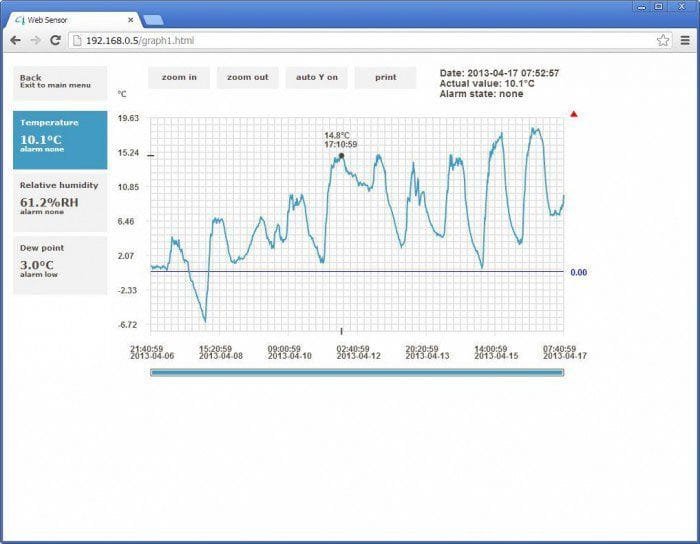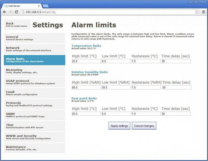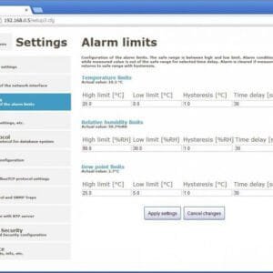 Ambient temperature, relative humidity t-line Web sensor. Remote alarm. Web Sensor with relative humidity and temperature probe. The device is supplied with a T+RH probe on the cable.