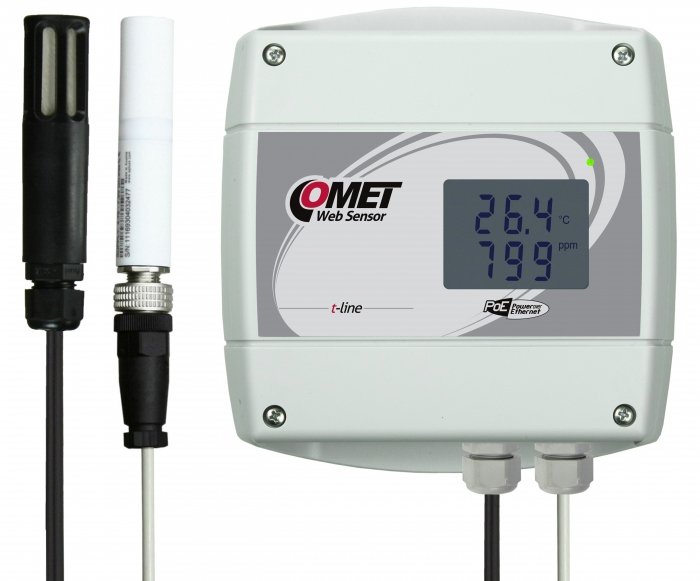 The T6641 is a t-line Web sensor for measuring temperature, humidity, and CO2 with a remote alarm. The T6641 uses temperature, humidity, and CO2 cable probes. The Web Sensor is equipped with an LCD display for showing current measured values. The Web Sensor can be integrated into the control systems of different manufacturers by connecting directly to a computer network using SNMP, MODBUS TCP, SOAP, syslog. The device setup can be made by the TSensor software which can be downloaded for free from the manufacturer’s website. One advantage of Web Sensors is the configuration of settings via web interface.