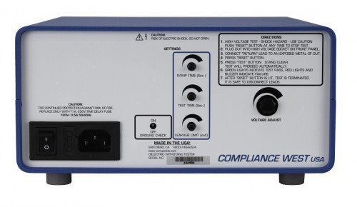 • Output voltage, leakage current limit, voltage ramp-up time, and test duration are controlled from the rear panel