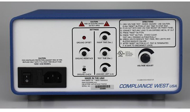 The newest product of Compliance West Hipot Line Testers, the UL Listed HT-S series hipot now comes with an adjustable ground continuity test in the range of 0.08 – 1.50 Ω, and Auto-offset for test leads up to 1.00 Ω. Performs 0-2000 AC or 0-2800 DC Hipot Test. Neutral/Hot to Ground Leakage current test up to 20 mA AC or 5 mA DC. Easy to use and connect. Ships complete with cables, manual, and a Calibration Certificate. Made in the USA. Calibration and repair services available.