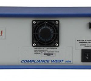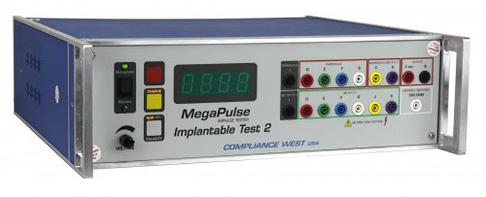 The MegaPulse Implantable Test 2 outputs the truncated exponential pulse used to defib-proof test implantable medical devices. Resistor networks described in the Standard Tests are included internally. The MegaPulse Implantable Test 2 can recharge and trigger the next pulse in 20 seconds, in accordance with the Standards. Positive and negative polarity are selected with a front panel switch, or via optional computer control. The computer control can conduct the test sequence shown in the Standard.