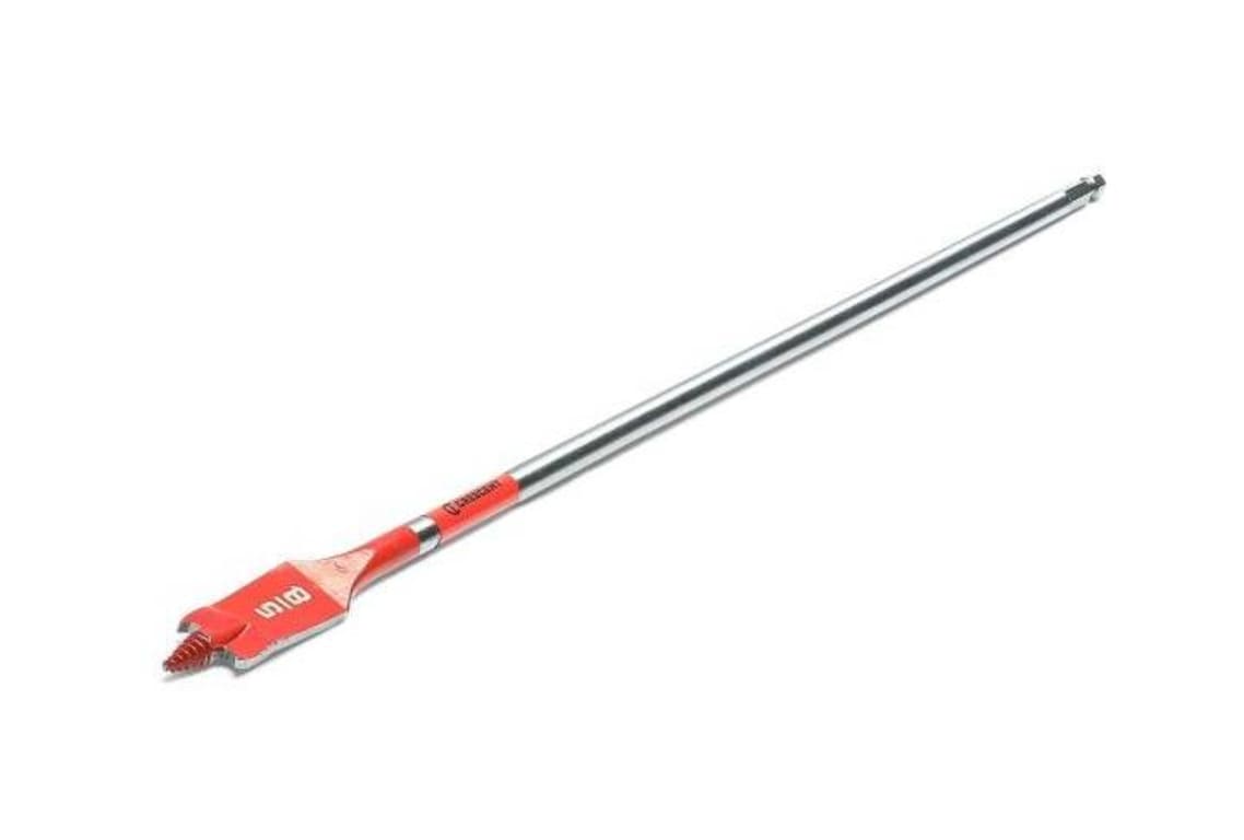 Crescent Screw Point Spade Bits provide one of the smoothest, self-feed, clean-cut drilling solutions—the ultimate performance tip design self-feeds for faster hole-making when compared to traditional spade bits. The reinforced cutting edges (spurs) tear through nails along with the optimized curved paddle flute design, increasing chip removal efficiency. The triple-sharpened high-speed steel improves the cut to be 15x faster than standard spade bits. The screw tip spade bit is impact rated including a torsion zone for increased shank stability and endurance in cordless and corded impact and drill drivers.