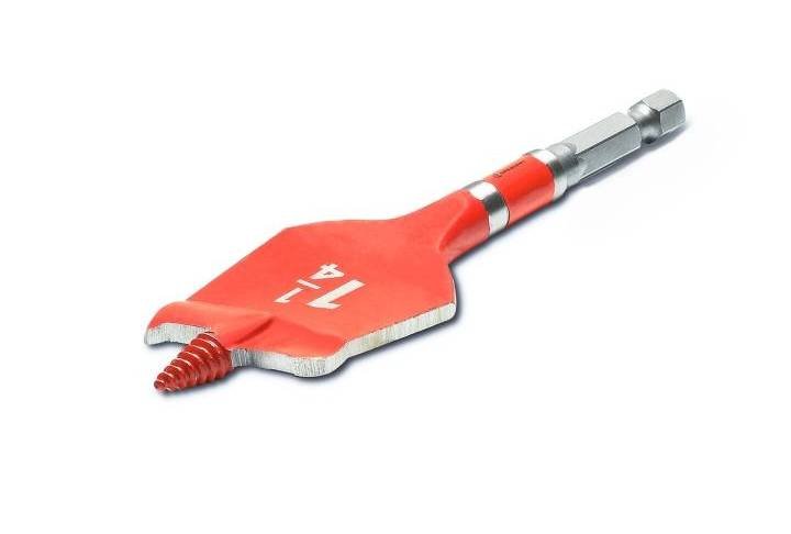 Crescent Screw Point Spade Bits provide one of the smoothest, self-feed, clean-cut drilling solutions. The ultimate performance tip design self-feeds for faster hole-making compared to traditional spade bits. The reinforced cutting edges (spurs) tear through nails along with the optimized curved paddle flute design, increasing chip removal efficiency. The triple-sharpened high-speed steel improves the cut to be 15x faster than standard spade bits. The screw tip spade bit is impact rated including a torsion zone for increased shank stability and endurance in cordless and corded impact and drill drivers.