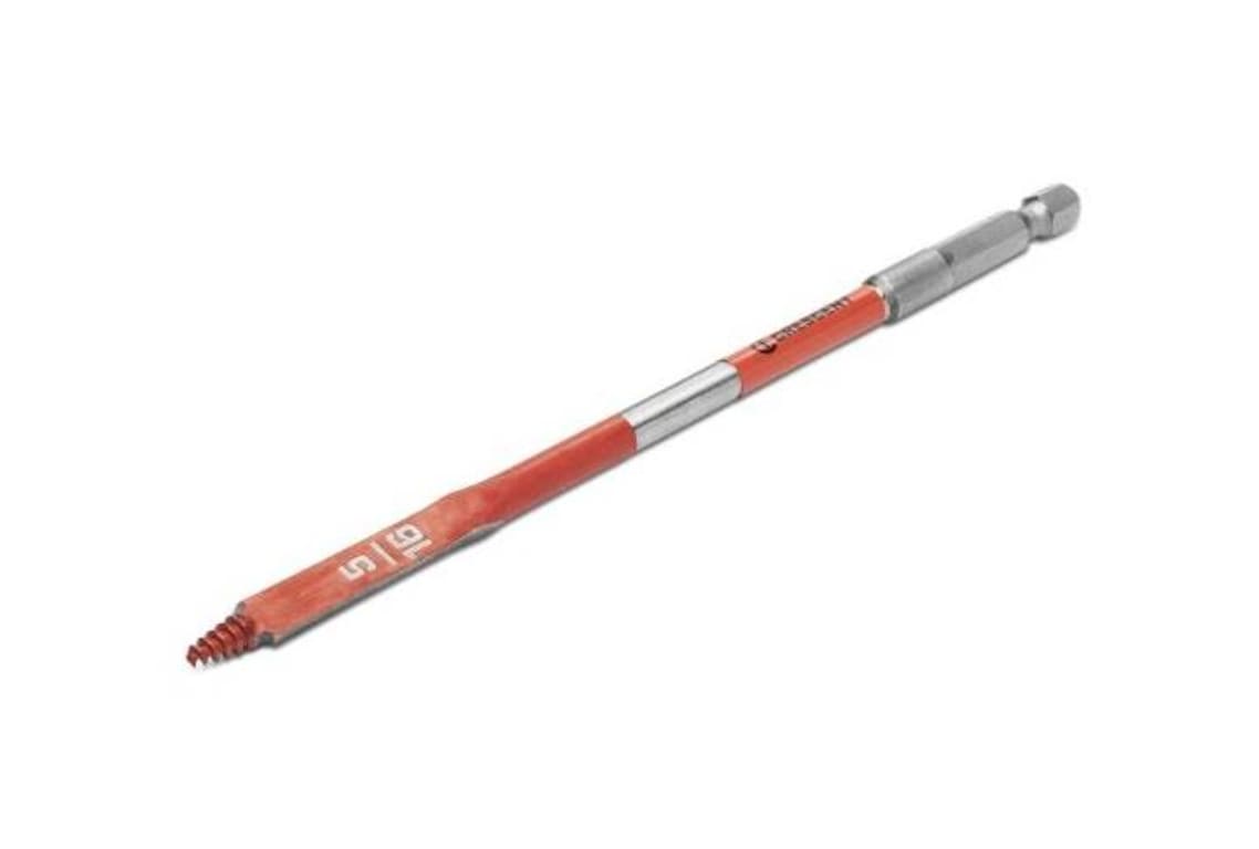 Crescent Screw Point Spade Bits provide one of the smoothest, self-feed, clean-cut drilling solutions. The ultimate performance tip design self-feeds for faster hole-making compared to traditional spade bits. The reinforced cutting edges (spurs) tear through nails along with the optimized curved paddle flute design, increasing chip removal efficiency. The triple-sharpened high-speed steel improves the cut to be 15x faster than standard spade bits. The screw tip spade bit is impact rated including a torsion zone for increased shank stability and endurance in cordless and corded impact and drill drivers.