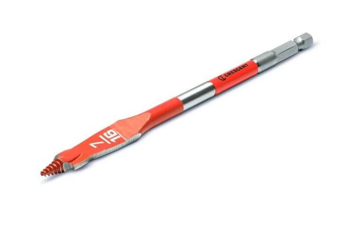 Crescent Screw Point Spade Bits provide one of the smoothest, self-feed, clean-cut drilling solutions. The ultimate performance tip design self-feeds for faster hole-making compared to traditional spade bits. The reinforced cutting edges (spurs) tear through nails along with the optimized curved paddle flute design, increasing chip removal efficiency. The triple-sharpened high-speed steel improves the cut to be 15x faster than standard spade bits. The screw tip spade bit is impact rated including a torsion zone for increased shank stability and endurance in cordless and corded impact and drill drivers.