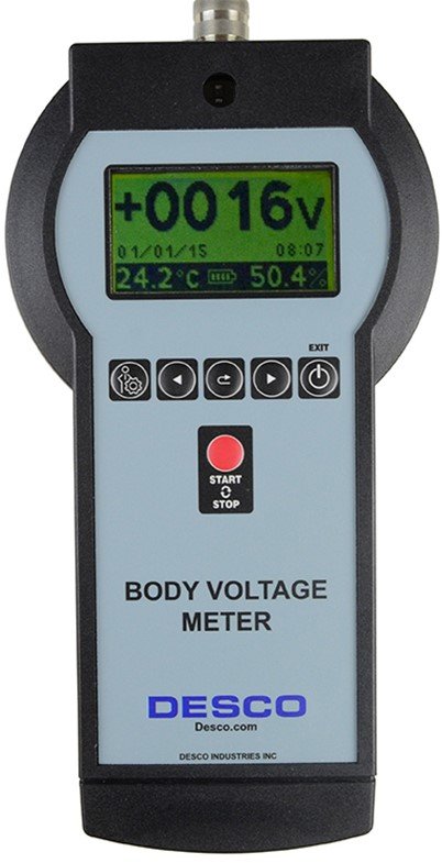 The Desco 19431 Body Voltage Meter is a portable measuring system that allows analysis of charge levels accumulated on the human body according to ANSI/ESD STM97.2. The Body Voltage Meter measurement may be logged using internal memory. Logged measurements can be exported and further reviewed on a PC. Graphs of measurements can be displayed on the LCD display for quick evaluation.