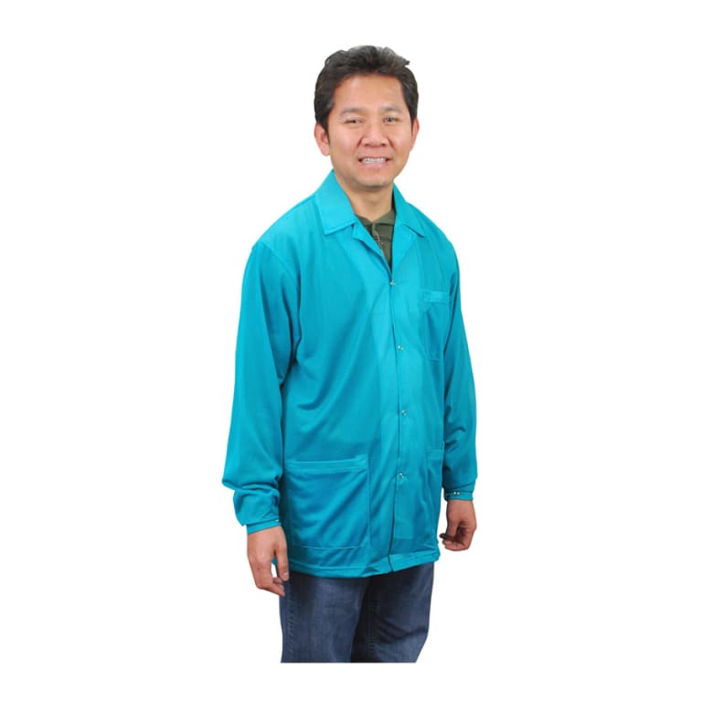 The Desco 73843 is a large, teal Statshield smock jacket that allows operators and a smock to be bonded or electrically connected to the ground to prevent ESD events in ESD-protected areas. It creates a Faraday cage effect that charges on worker clothing shielded, protecting ESDS devices. It enables the operator of the ground with no need for a cord to be attached to the operator’s wrist. A minimum of 9% carbon conductive nylon fibers woven in a chain-link design provides continuous and consistent charge dissipation. The panel-to-panel conductivity prevents isolated charged conductors in ESD-protected areas.