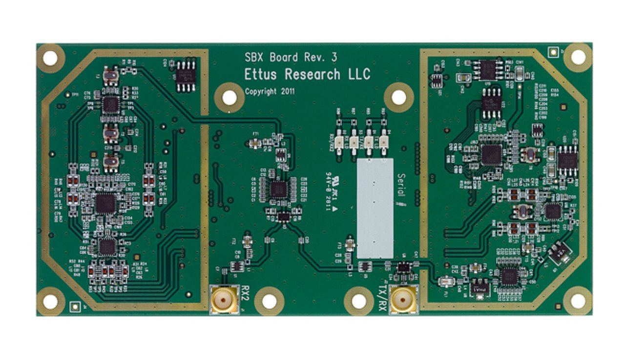 The Digilent Ettus SBX is a wide bandwidth transceiver that provides up to 100 mW of output power, and a typical noise figure of 5 dB. The local oscillators for the receive and transmit chains operate independently, which allows dual-band operation. The SBX is MIMO capable and provides 40 MHz of bandwidth. The SBX is ideal for applications requiring access to a variety of bands in the 400 MHz-4400 MHz range. Example application areas include Wi-Fi, WiMAX, S-band transceivers, and 2.4 GHz ISM band transceivers.