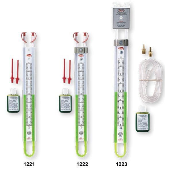 These inexpensive manometers measure positive, negative, and differential pressures. Dwyer® Flex-Tube® U-Tube Manometers combine the inherent accuracy of the simple “U” Tube with the durability of tough, long-lasting plastic construction. Columns are of .375″ O.D. flexible and shatterproof clear butyrate tubing. They are easily accessible for cleaning. The indicating tube is backed by a white scale channel to provide maximum color contrast. Scales are extruded high-impact polystyrene plastic formed to hold columns in perfect alignment. Stark white scales have graduations and numbers silkscreen-printed in black for maximum legibility.