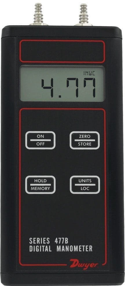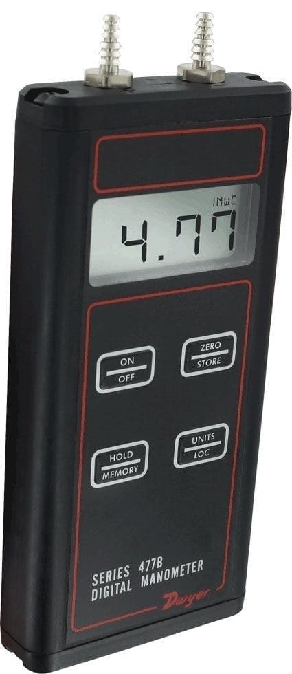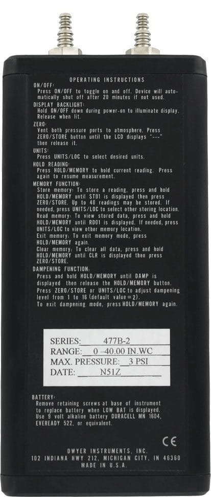 The Series 477B Handheld Digital Manometer is a versatile, hand-held, battery-operated manometer available in several basic ranges from 0-20 in w.c. up to 100 psi. All models measure either positive, negative or differential pressures with ±0.10% of full-scale accuracy. You can select from up to seven common English and metric pressure units so conversions are not necessary. A memory function allows storage of up to 40 readings for later recall and a backlight provides auxiliary lighting for hard-to-see locations. Also standard are a hold feature plus both visual and audible overpressure alarms.