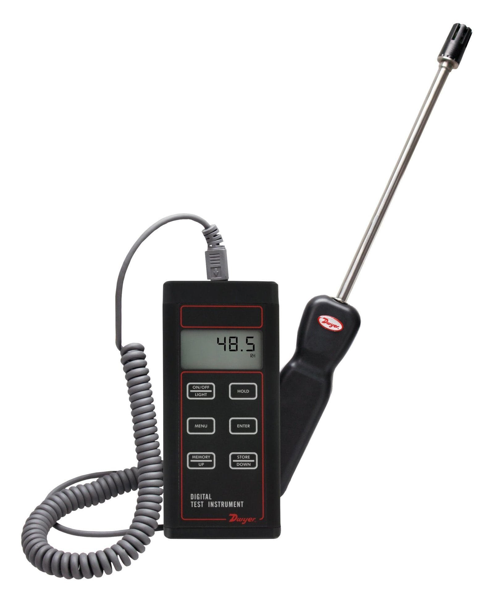 The Dwyer 485B-1 Thermo-Hygrometer is a versatile, compact, handheld instrument for measuring the percentage of relative humidity and temperature in °F or °C. Dew point and wet bulb temperatures are derived from the relative humidity and temperature measurements and are displayed on the LCD.