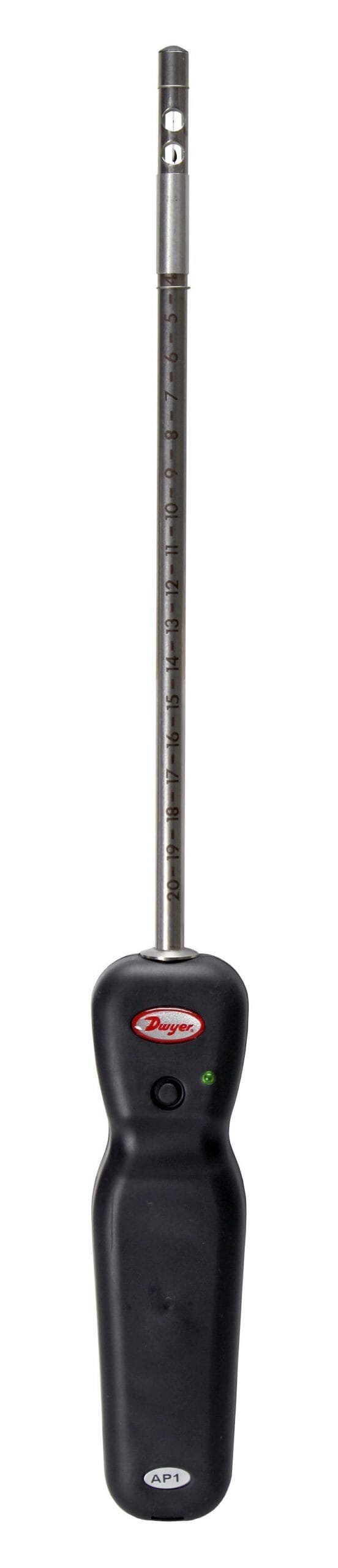 The Dwyer AP2 Wireless Thermo-Anemometer Probe measures air velocity, airflow, and temperature when combined with the Model UHH2 Universal Handheld. In order to prevent damage to the sensing element, the probe has a protective sleeve that slides over the sensor when it is not in use. Markings on the probe allow users to know the insertion depth to obtain better accuracy when traversing the duct.