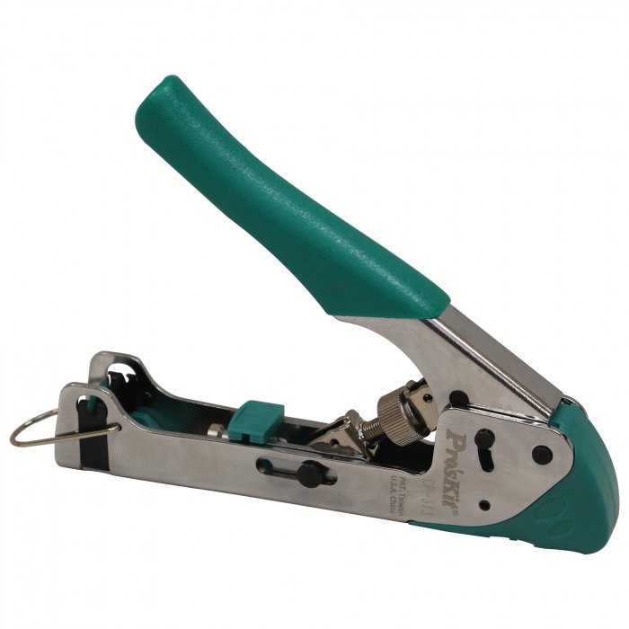 Crimps RG59, RG6, and RG6 Quad “F”-type compression connectors.
