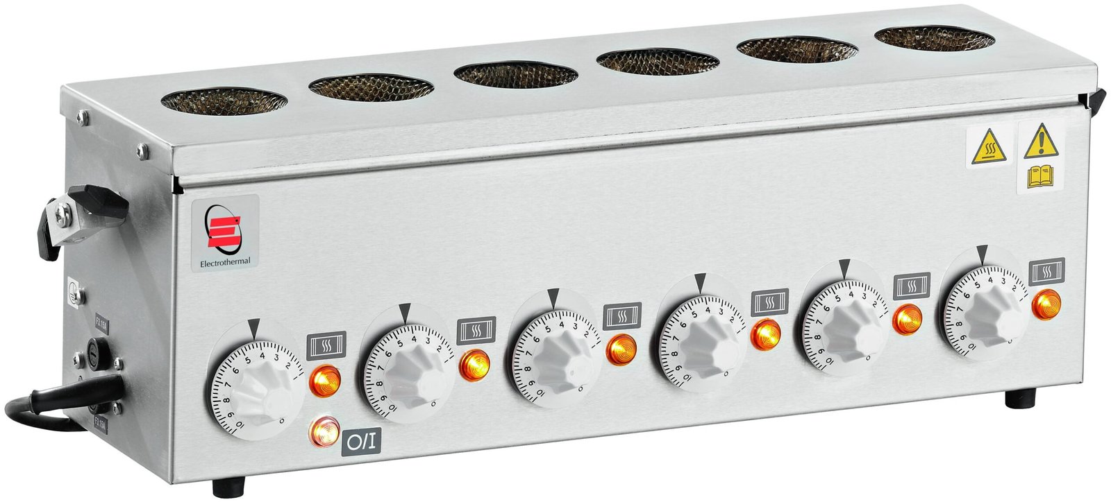 Each heating mantle has its own energy regulator incorporating an On/Off switch and a “Mains to Heater” amber neon indicator. There is also a “Mains On” clear neon indicator on the front panel.