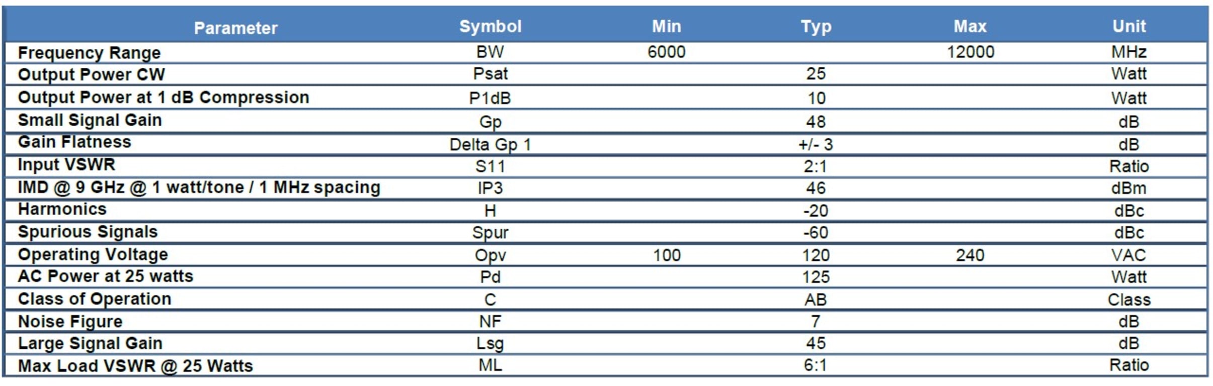 - Output Power CW: 25 Watts (Psat)