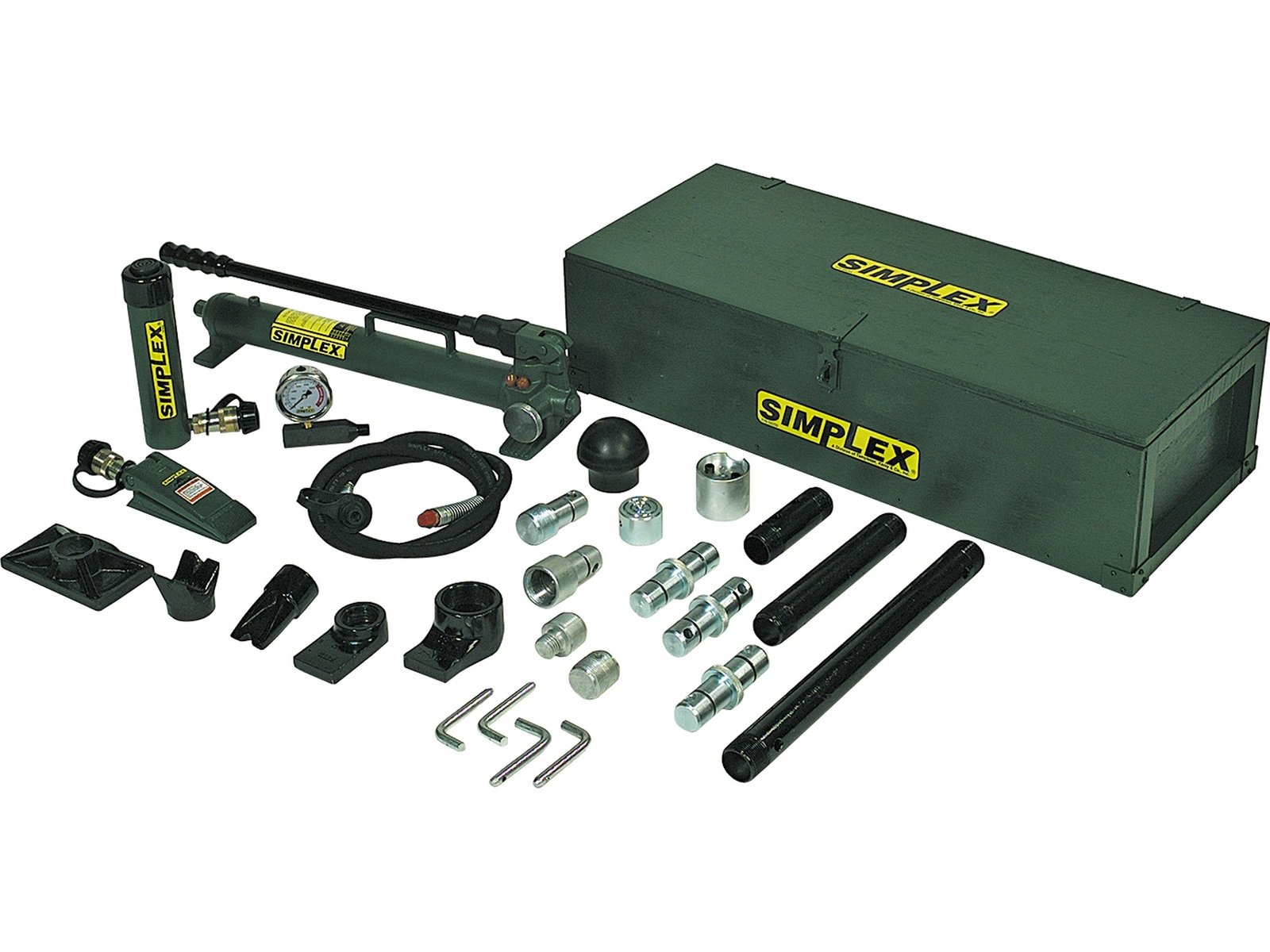 The Enerpac MK106 is a general-purpose hydraulic cylinder and hand pump maintenance set that provides a complete assortment of attachments that greatly expands the range of applications. Using these various attachments allows you to custom-build spreaders, straightening tools, clamps, and a wide variety of problem-solving maintenance tools. R106 is rated at 10 tons at 10,000 psi. When using attachments or extensions, do not exceed a 5,000 psi (5 tons) reading on the gauge. Accessories and extensions are only rated at 5 tons. The S2000A Spreader has an operating capacity of 1 ton. Add a collar toe and a flat base to build a custom spreader or toe jack. Extensions, custom heads, and adapters allow you to create tools that solve hundreds of problems. Simplex MK106 kits are used extensively for collision repair. Add a V-base and a flat base for spreading, holding, and bending jobs.