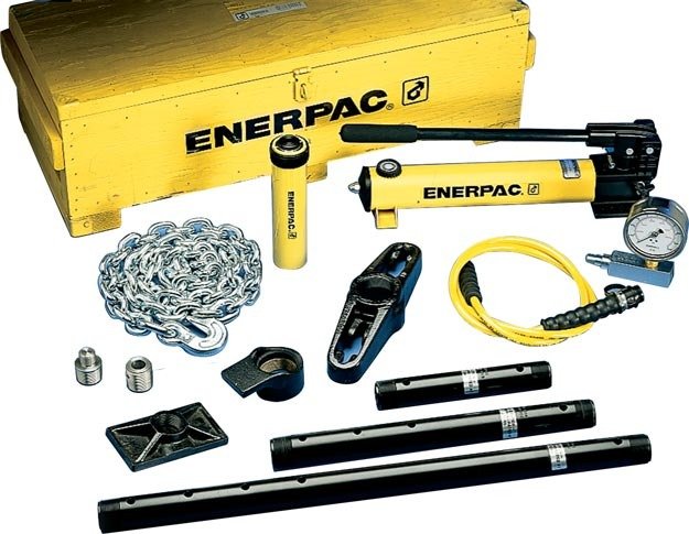 The Enerpac MSFP5 is a hydraulic cylinder and hand pump set with 24 cylinder attachments. Enerpac maintenance sets are a complete assortment of accessories matched to hydraulic-powered tools. Using these sets allows you to quickly configure a unique tool to meet your most difficult jobs. Built around the Enerpac lightweight hand pump, hose, and cylinder, these sets enable you to push, pull, lift, press, straighten, spread and clamp. When cylinders are used with maintenance set attachments or components, the maximum system pressure must be limited to half the rated pressure (5,000 psi). If no attachments are being used, capacity is doubled at these values. The maximum operating pressure is then 10,000 pounds per square inch. Only use the attachments provided with the set. Non-Enerpac attachments and longer extension tubes will reduce column strength, potentially creating unsafe conditions.