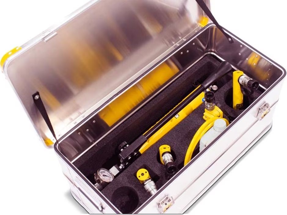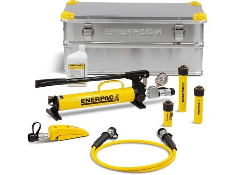 The Enerpac SC05HTB is a 5 tons hydraulic cylinder and hand pump toolbox set. The multifunctional Enerpac 5-Ton Toolbox Set is tailored for technicians requiring up to 5 tons of capacity for lifting and pushing jobs, this toolbox includes three 5-ton hydraulic cylinders with different heights, a hand pump, wedge spreader, and the essential components in an industrial-strength aluminum container. It is designed to enhance job-site performance. It provides a convenient and portable solution for all your lifting and pushing requirements up to 5 tons. The industrial strength container keeps tools organized and secure.
