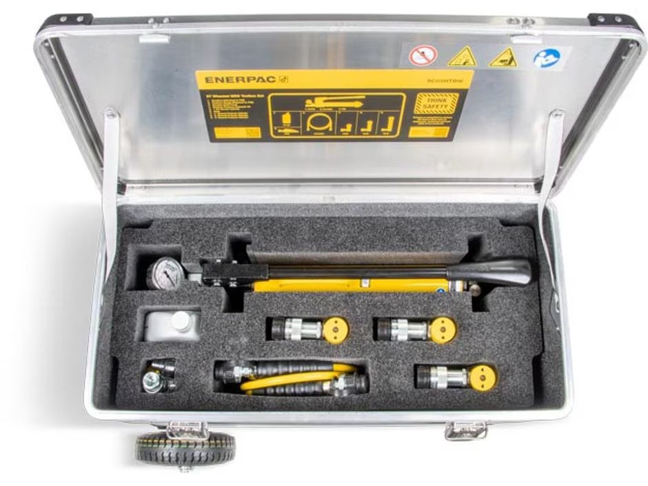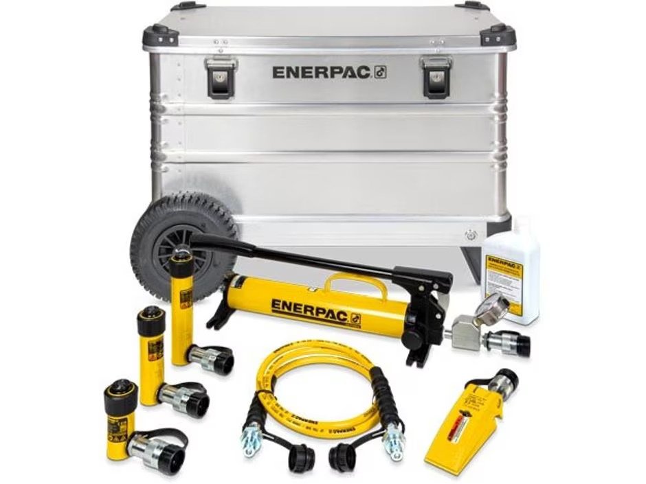 The multifunctional Enerpac 5-Ton Wheeled Toolbox Set is tailored for technicians requiring up to 5-tons of capacity for lifting and pushing jobs, this toolbox includes three 5-ton hydraulic cylinders with different heights, hand pump, wedge spreader and the essential components in an industrial-strength aluminum container for getting to work immediately.